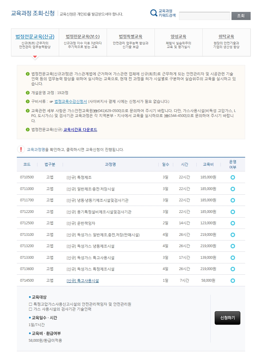 법정전문교육(신규) 특고사용시설 1일 7시간(58,000) 교육을 받아야합니다.