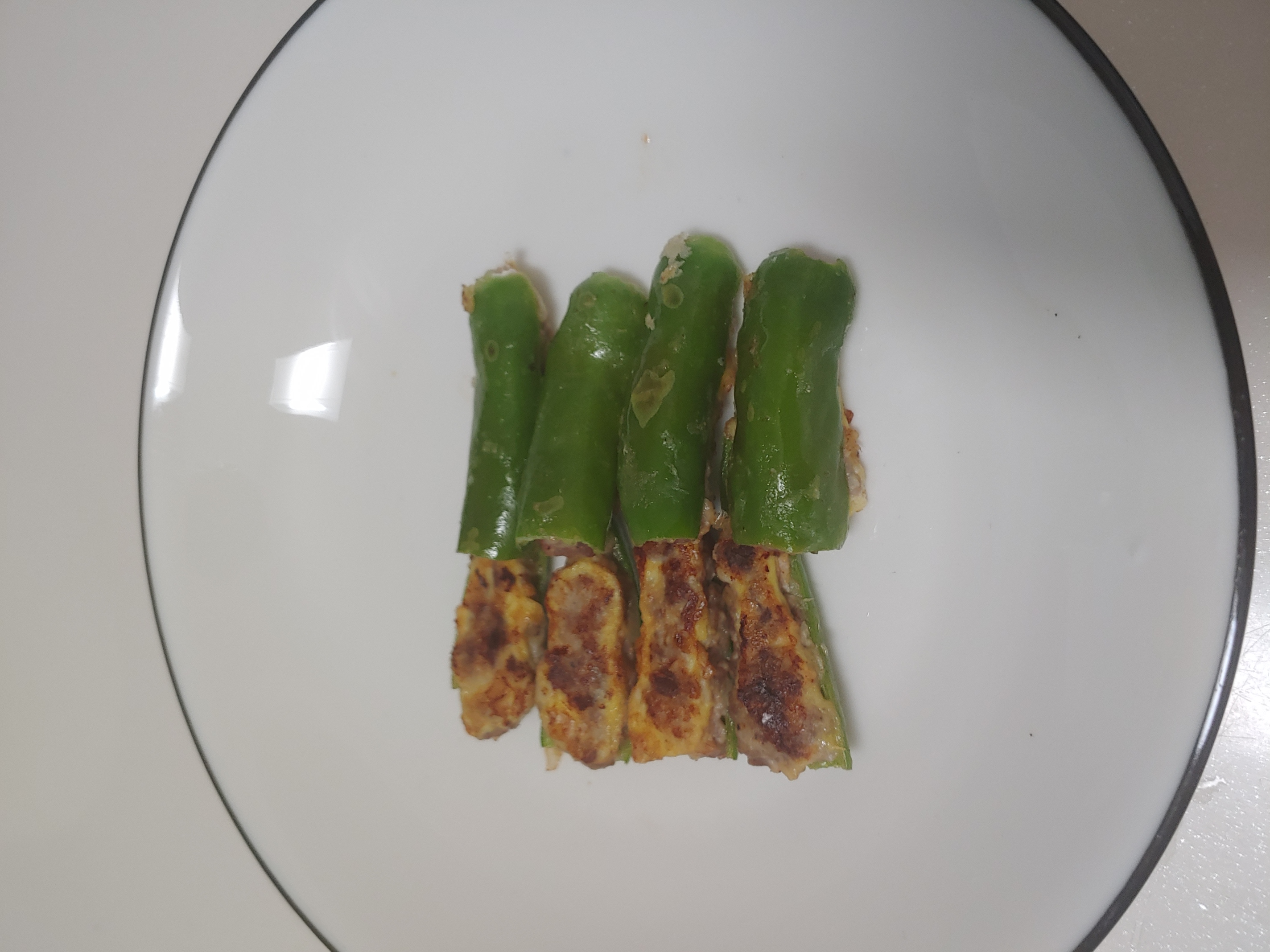 풋고추는 반으로 갈라서 씨를 빼고 소금물에 데쳐야하는데 저는 데치지않고 바로해버렸네요. 아차... 표고전과 마찬가지로 속을 이쁘게 넣어야하는데 쉽지않네요. 소고기를 좀더 잘게 다져서 넣어야될거같아요. 풋고추전도 참 인간적인 비주얼입니다.