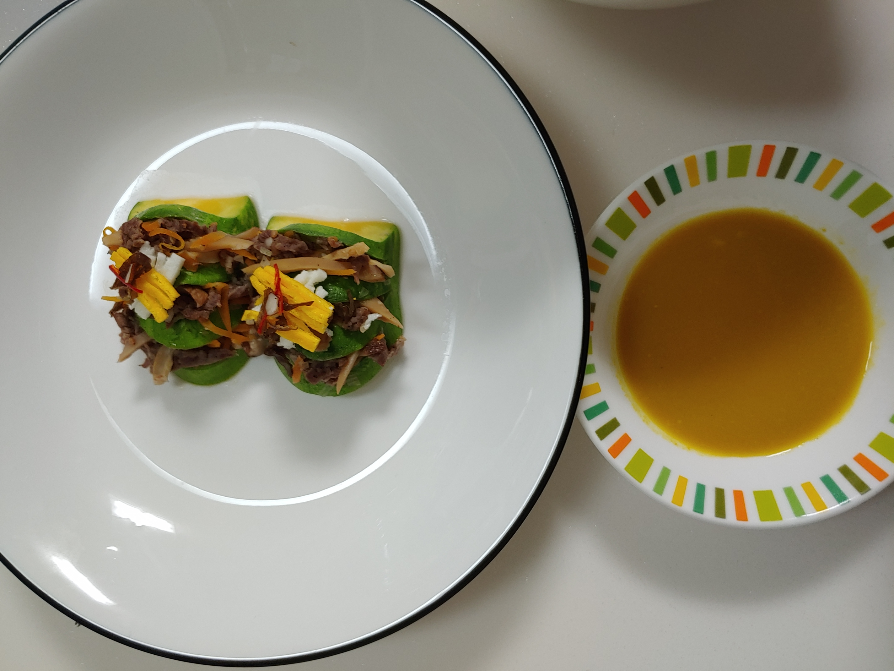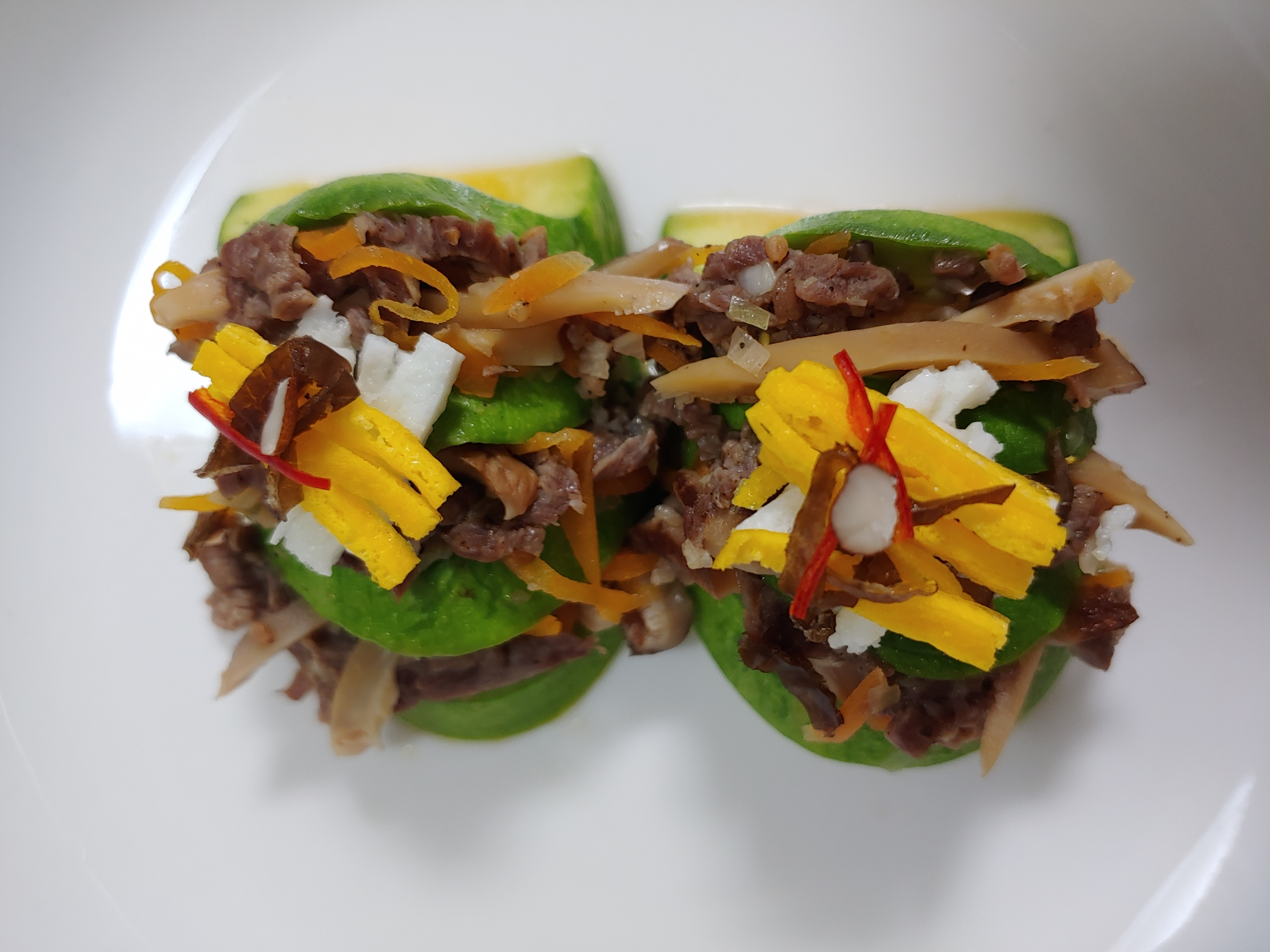 먼저 호박선 만들어봅니다. 호박선은 4cm 로 어슷썰기해서 3번칼집넣어 고명넣고 2개만들어서 겨자장과 같이 제출해야합니다. 소고기 표고버섯 당근 채썰어서 양념후 소를 만들고요. 달걀 황 백지단 0.1cm x 0.1cm x 2cm 채썰고, 석이버섯 실고추 잣도 준비합니다.