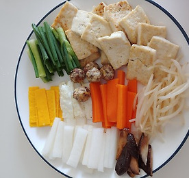 두부전골 소고기는 육수용과 완자용으로 나눠서 사용합니다. 핏물을 제거한 소고기는 물3컵에 대파, 마늘 넣어 끓여 면보에 거른후 간장으로 색을내고 소금으로 간해놓습니다. 두부는 3cm x 4cm x 0.8cm 로 7개이상 썰어 소금으로 간하고 겉면에 전분가루를 묻혀 팬에 구워냅니다. 두부도 완자용으로 조굼 남겨둬야합니다. 무, 당근은 5cm x 1.2cm x 0.5cm 로 골패썰기해서 데치고, 불린표고버섯은 같은크기로 썰어서 간장, 참기름으로 양녑해둡니다. 숙주는 머리와 꼬리를 데서 데친후 소금, 참기름에 무쳐두고, 실파는 5cm 길이로 썹니다. 다진파, 다진마늘, 다진 소고기에 물기를 짠 두부를 으깨서 섞어줍니다. 여기에 소금, 깨소금, 후춧가루, 참기름넣어 반죽해서 지름1.5cm로 완자 5개를 빚어 밀..